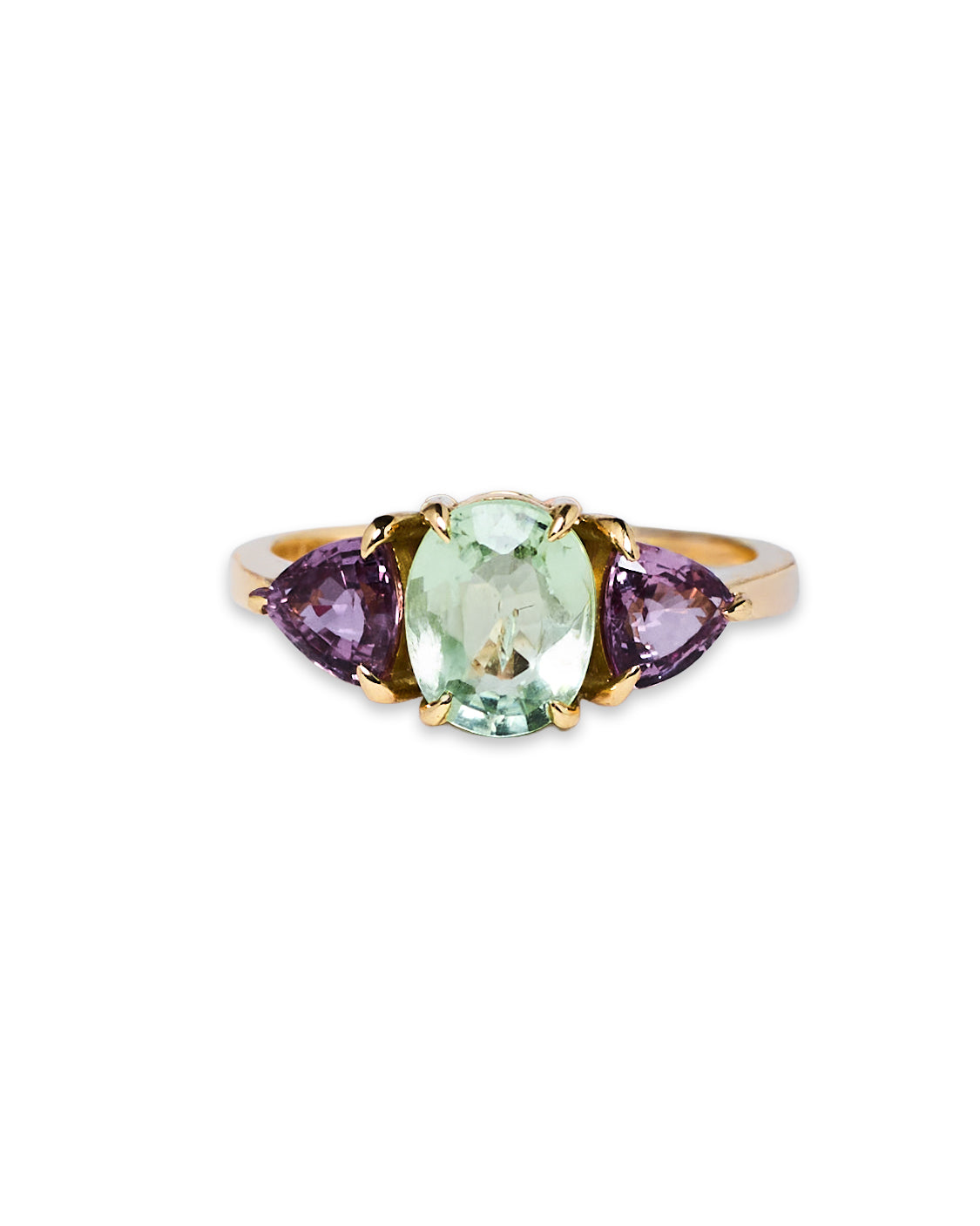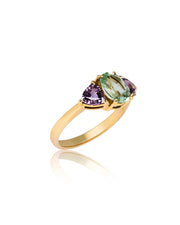 Anel com turmalina central verde (1,23cts) e safiras rosas laterais lapidação trillion (1,12cts). Ouro 18k.