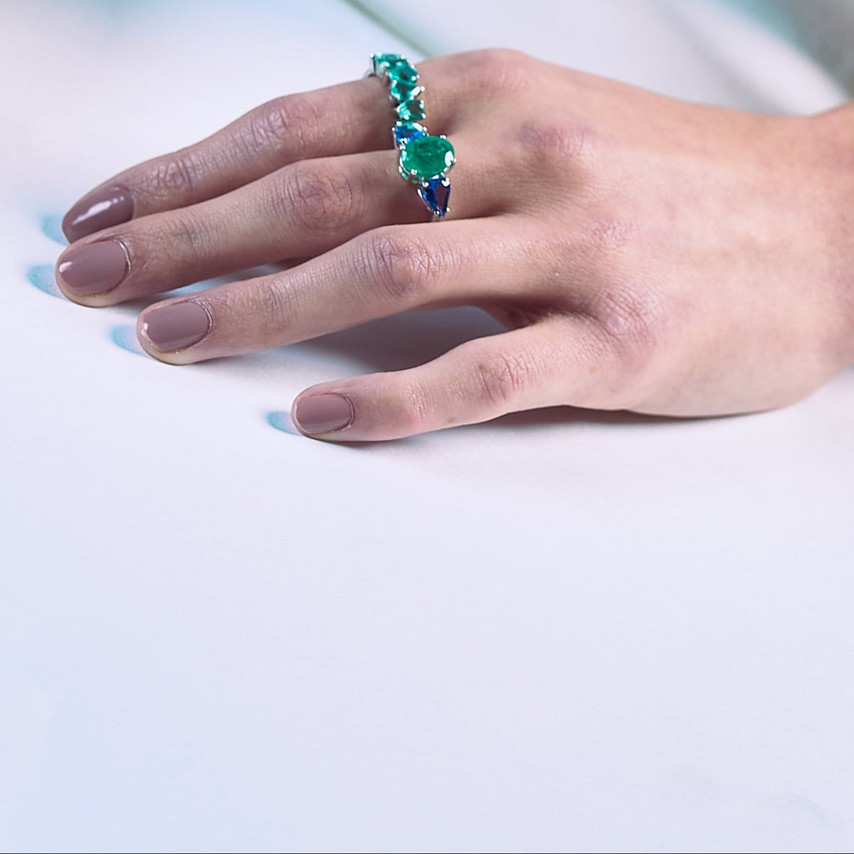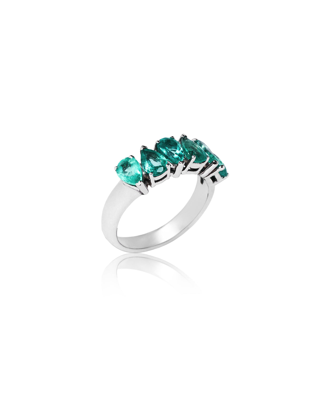 Anel meia aliança de esmeraldas com lapidação gotas (1,25cts). Ouro 18k.
