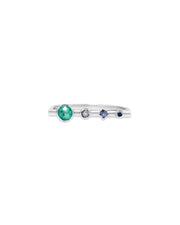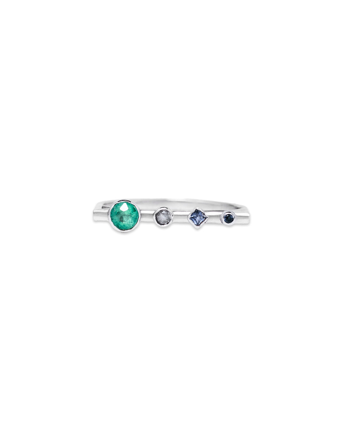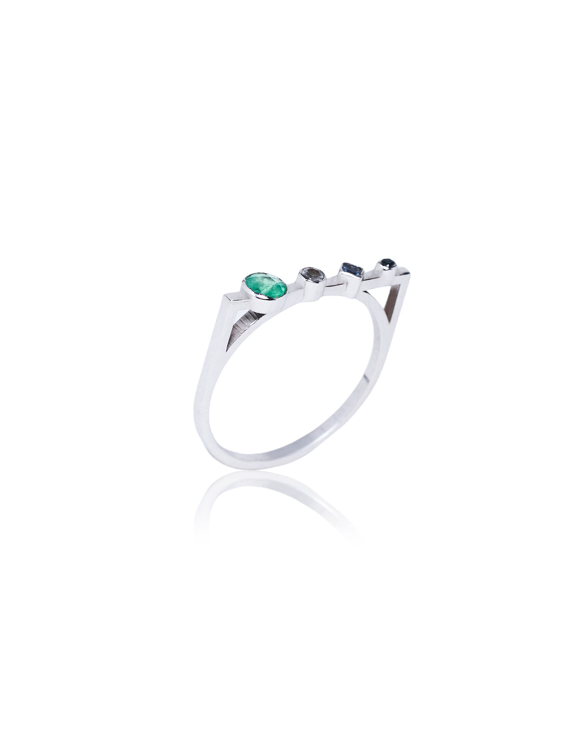 Anel geometrico com esmeralda e safiras azuis. Ouro 18k.