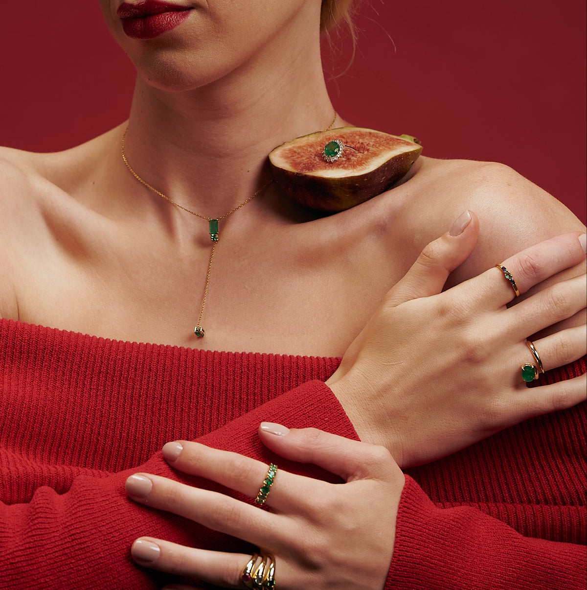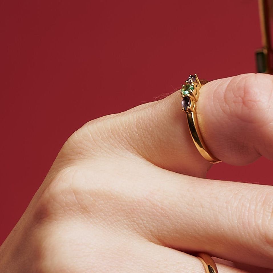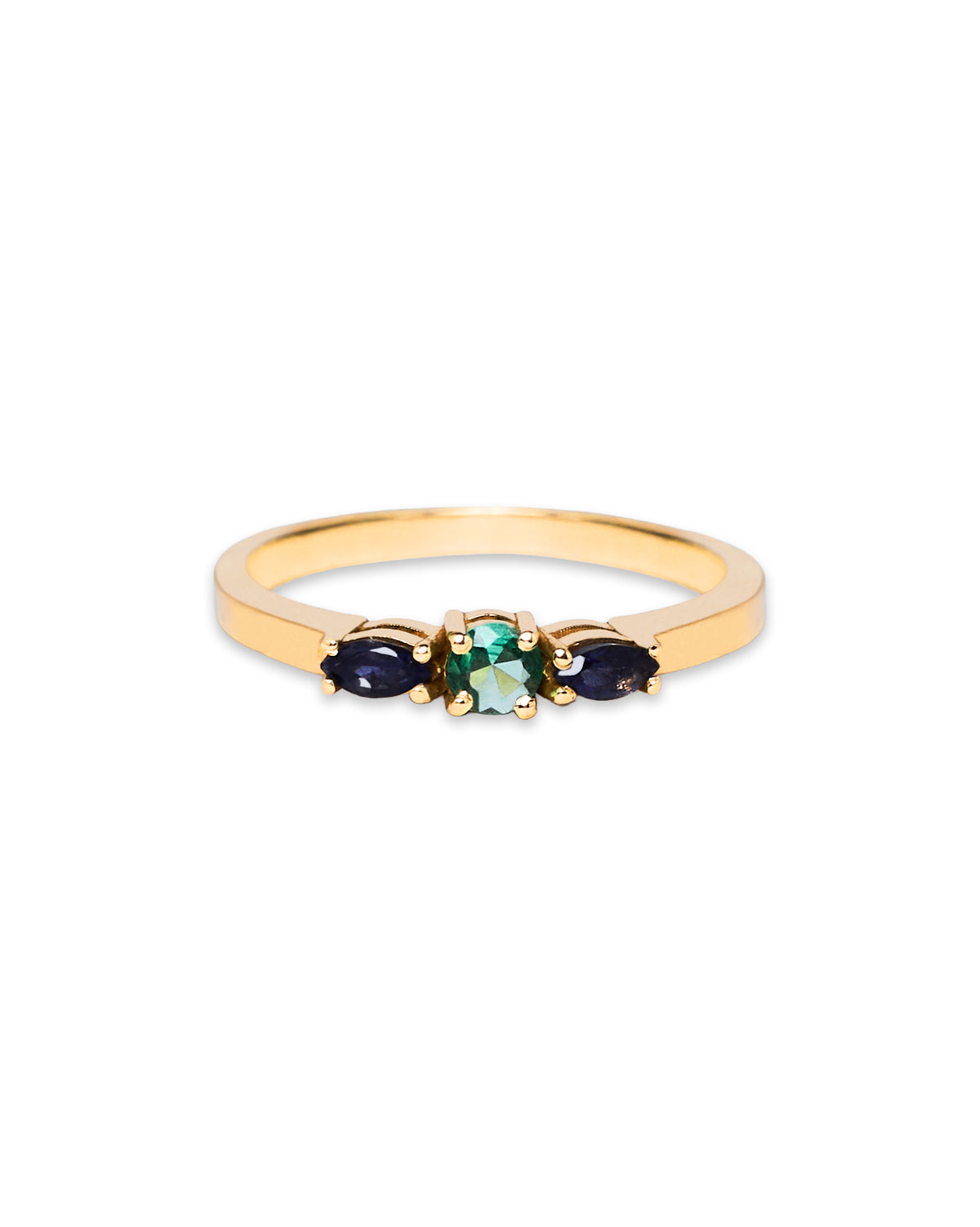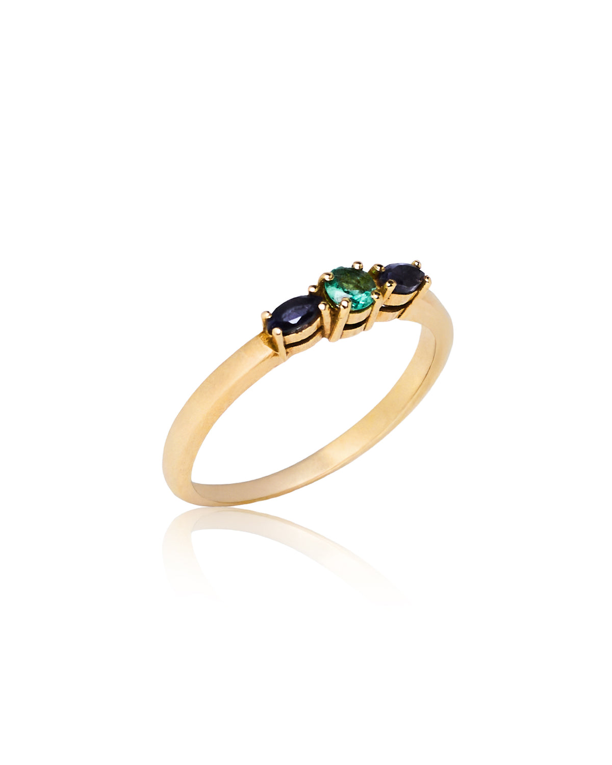 Anel modelo Mia, com esmeralda central e iolitas nas laterais. Ouro 18k.