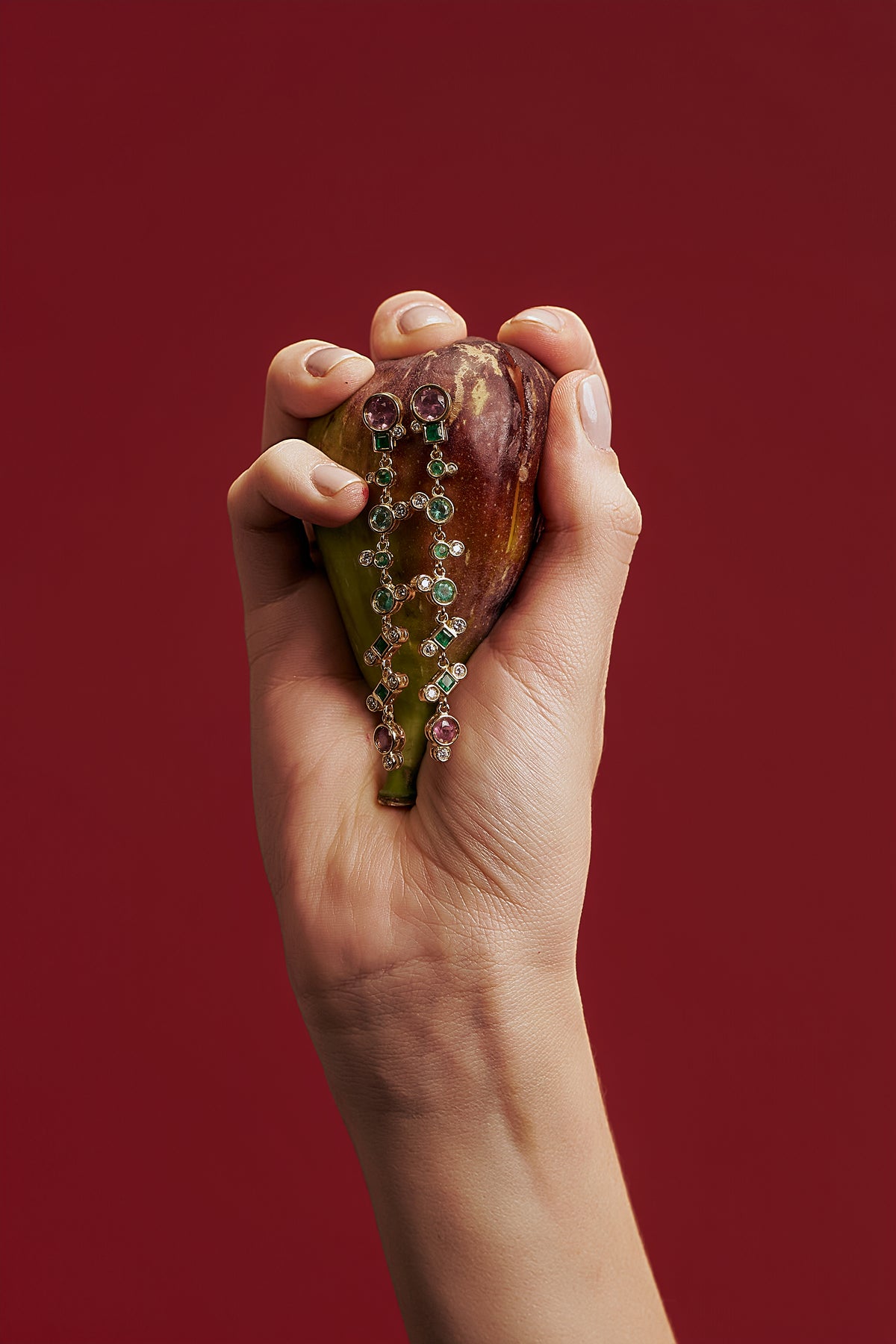 Brinco geométrico com esmeraldas, diamantes e turmalinas rosas.